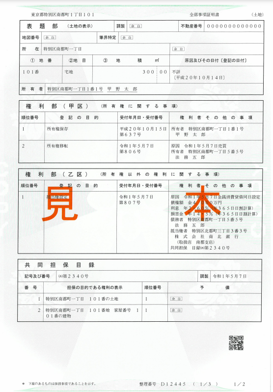 例えば、住宅ローンを組んで住宅購入をする場合には、土地と建物の両方を担保にすることが多く、共同担保として土地と建物が共同担保目録に記載されます。